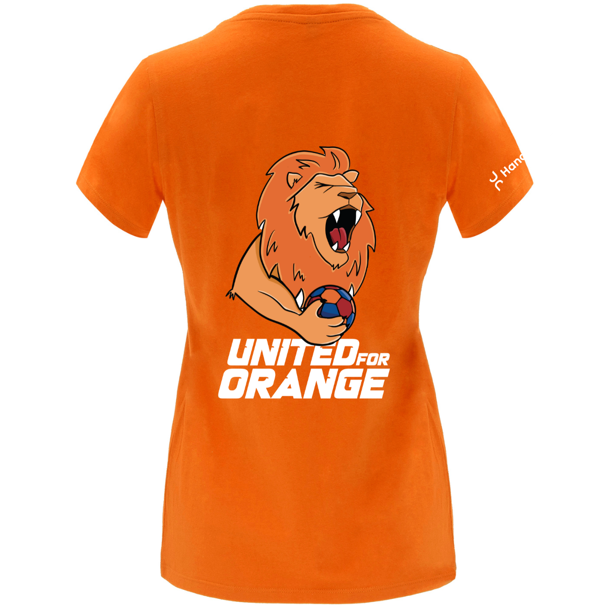 Dit United for Orange T-shirt in damesmodel is getailleerd gesneden voor een vrouwelijke pasvorm en gemaakt voor de supporters van het Nederlands herenhandbalteam. Het oranje shirt heeft korte mouwen, een ronde 1×1 ribboord en een verstevigde nekband in dezelfde kleur. Gemaakt van 100% katoen, single jersey, 170 g/m², waardoor het licht en comfortabel is, maar toch een mooie drukkwaliteit biedt. Op de borst staat een grote United for Orange-logo en op de rug een grote United for Orange-logo-opdruk, zodat je zowel van voren als van achteren duidelijk laat zien bij welke supportersclub je hoort. Op de rechter mouw staat het HandbalNL-logo. Oeko-Tex Standard 100 gecertificeerd.